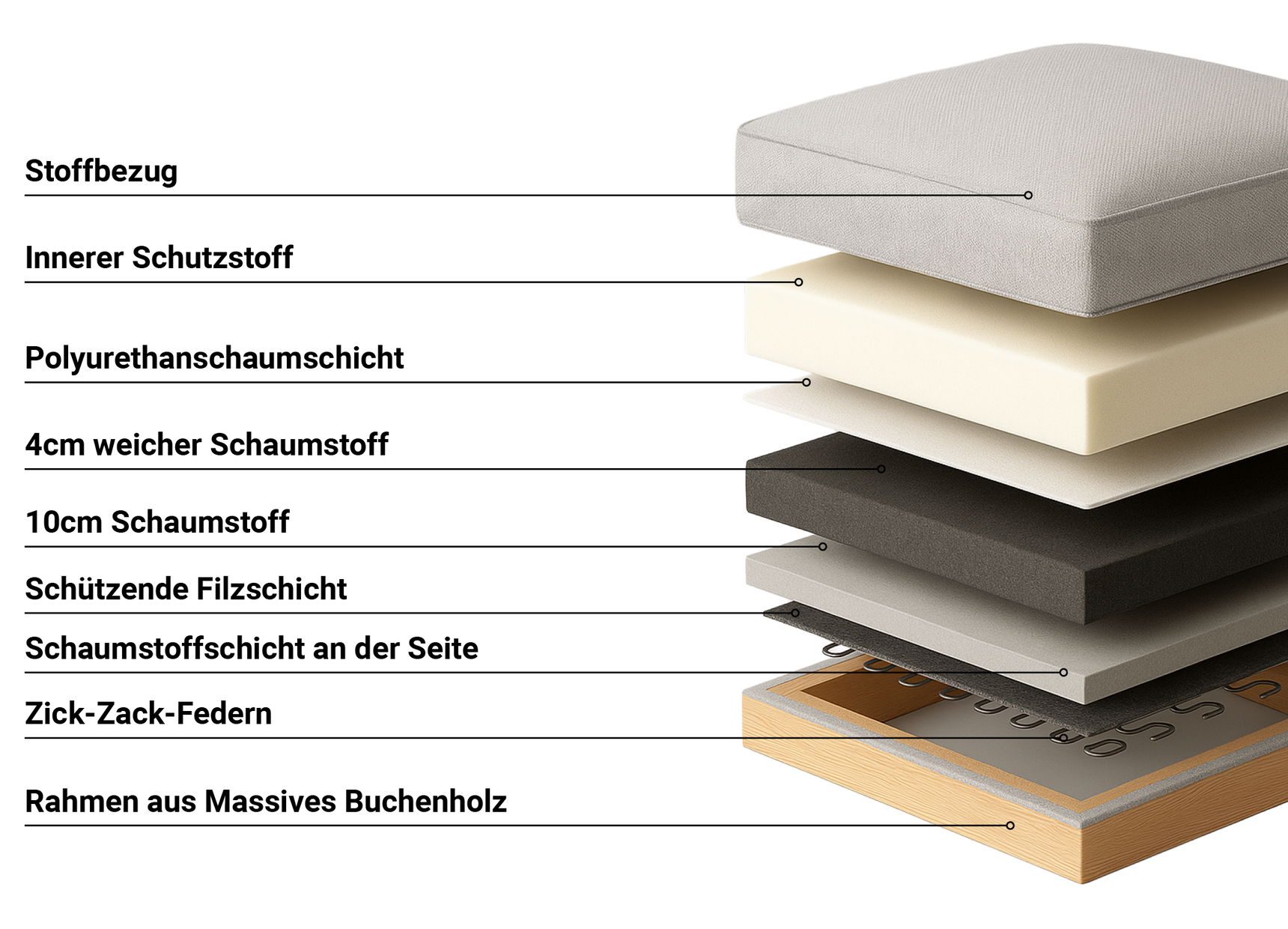 Das Innenleben von Louis besteht aus nachhaltigen und hochwertigen Materialien. Durch die verschiedenen Schichten sowie die Schutzschicht aus Stoff eignet sich das Sofa optimal für Allergiker.
